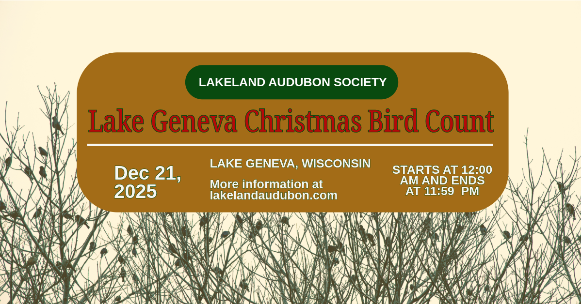 On Sunday, Dec. 21, 2025, local birders will have their opportunity. Our Lake Geneva circle is centered at the Ridge Hotel on Highway 50, near the southwest end of Lake Como. We divide the circle into several zones, and typically one or two birders cover each zone by car and hiking, with a few of us hiking small areas. Those who live within the count circle are also encouraged to participate by watching feeders in their yards. Our count will be coordinated by Lisa Granbur, with data compiled afterwards by Kyle Cudworth.