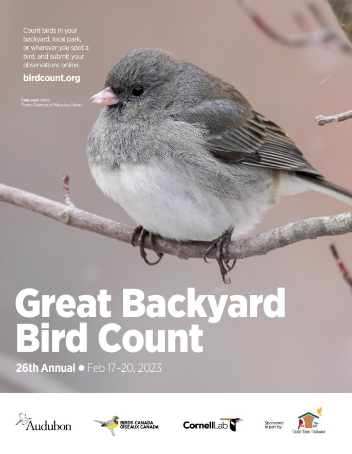 The Great Backyard Bird Count is a joint project of the Cornell Lab of Ornithology, National Audubon Society, and Birds Canada and is made possible in part by founding sponsor Wild Birds Unlimited.